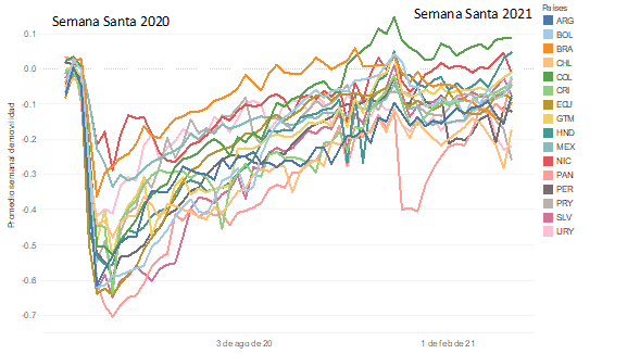 Hace un año, en la Semana Santa del 2020, la región y el mundo se encontraban con las mayores restricciones a la movilidad que se han visto desde que comenzó la pandemia. Cada país con sus diferentes posibilidades y contextos locales aplicaron la estrategia de “quedarse en casa” y limitar la movilidad de las personas con el fin de disminuir la transmisibilidad del virus y poder contener el crecimiento exponencial de la pandemia con el fin de evitar la saturación de los sistemas de salud.