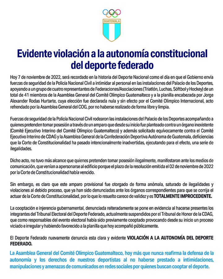 Por su parte, miembros del COG emitieron un comunicado en el que rechazan la acción de Rodas y califican de invalida la resolución de la CC.