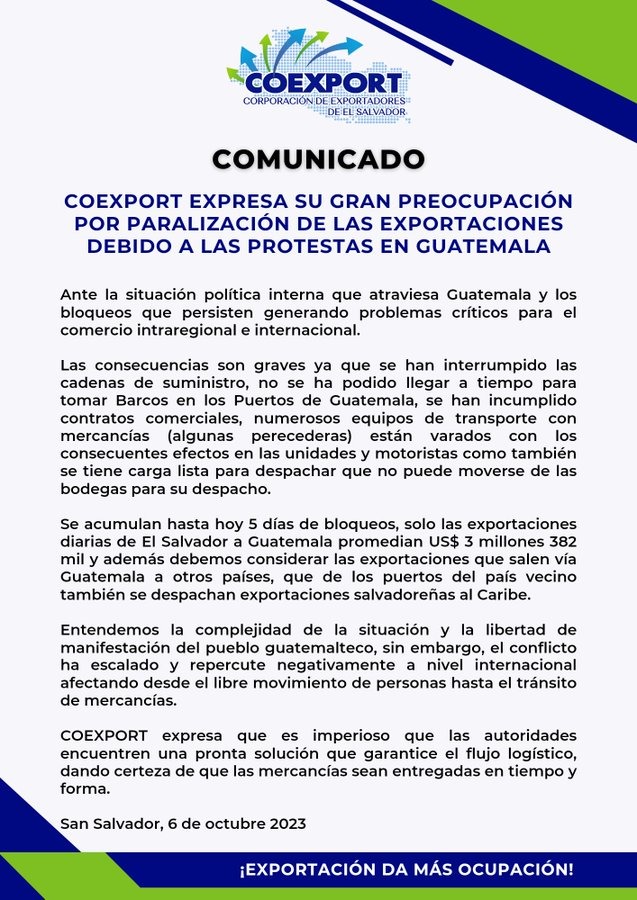 Ante la situación política interna que atraviesa Guatemala y los bloqueos que persisten generando problemas críticos para el comercio intraregional e internacional, la Corporación de Exportadores de El Salvador (COEXPORT), señala que, las consecuencias son graves ya que se han interrumpido las cadenas de suministro, no se ha podido llegar a tiempo para tomar Barcos en los Puertos de Guatemala.