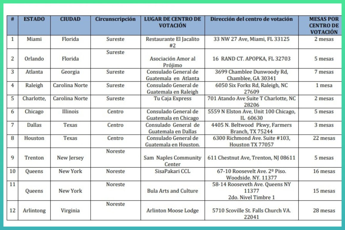 Los centros de votación que ya se encuentran confirmados, se ubican en las ciudades de: Florida, Georgia, Carolina del Norte, Illinois, Texas, New Jersey, New York, Virginia, California y Nevada.