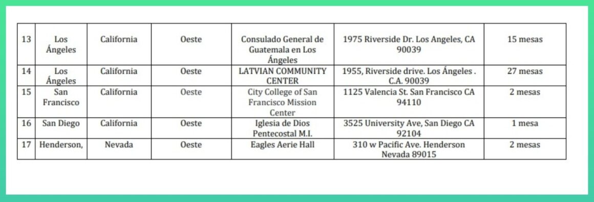 Los centros de votación con mayor número de mesas habilitadas son: Arlinton Moose Lodge, en Virginia, en donde se habilitaron 28 mesas, seguido de Latvian Community Center, ubicado en Los Ángeles, California, en donde se habilitarán 27 mesas para los connacionales que deseen emitir su voto.