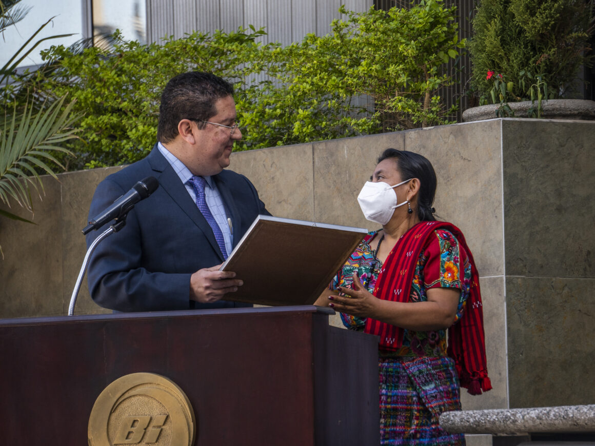 El homenaje dio lugar en la Plaza Cívica Ramiro Castillo Love, ubicada en el centro financiero, en donde el Licenciado Alejandro Ortíz, representante de la Gerencia General de Banco Industrial, hizo entrega de un reconocimiento a la señora María Tuyuc Velásquez.