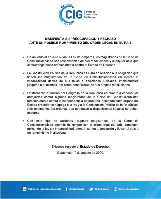 Con un comunicado de prensa la Cámara de Industria de Guatemala (CIG), expone su opinión sobre dos situaciones de la coyuntura nacional: el accionar de la Corte de Constitucionalidad (CC) y las declaraciones gubernamentales que amplían disposiciones sobre la pandemia.