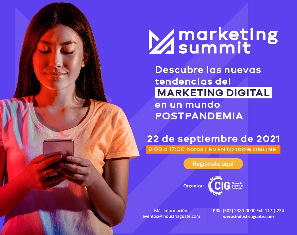El próximo miércoles 22 de septiembre de 8:00 a.m. a 5:00 p.m. (hora de Guatemala) se realizará el primer Marketing Summit, un evento 100% online organizado por Cámara de Industria de Guatemala (CIG) que busca proveer estrategias post pandemia para la transformación del consumidor en un mundo digital.