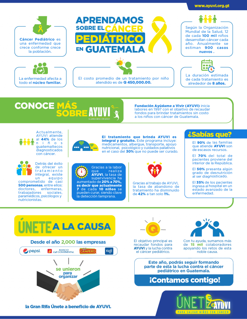Nuevamente, los guatemaltecos tienen la oportunidad de darles el poder a los niños de luchar contra el cáncer. Esto a través de su apoyo a la Rifa Únete organizada por Pollo Campero, Pepsi, Banco G&T Continental y Tigo, a beneficio de la Fundación Ayúdame a Vivir, AYUVI; entidad que recauda fondos necesarios para que estos pequeños guerreros puedan recibir tratamiento oncológico gratuito en la Unidad de Oncología Pediátrica, UNOP.