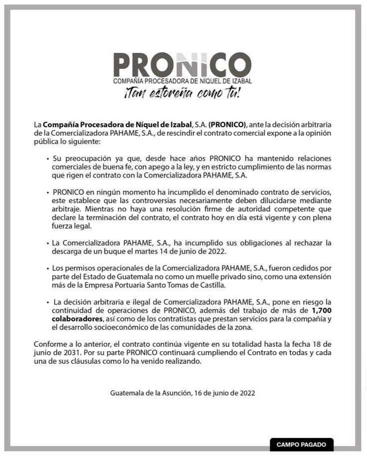 La Compañía Procesadora de Níquel de Izabal, S.A. (PRONICO) expresó su preocupación ante la decisión arbitraria de la Comercializadora PAHAME, S.A., de rescindir el contrato comercial.