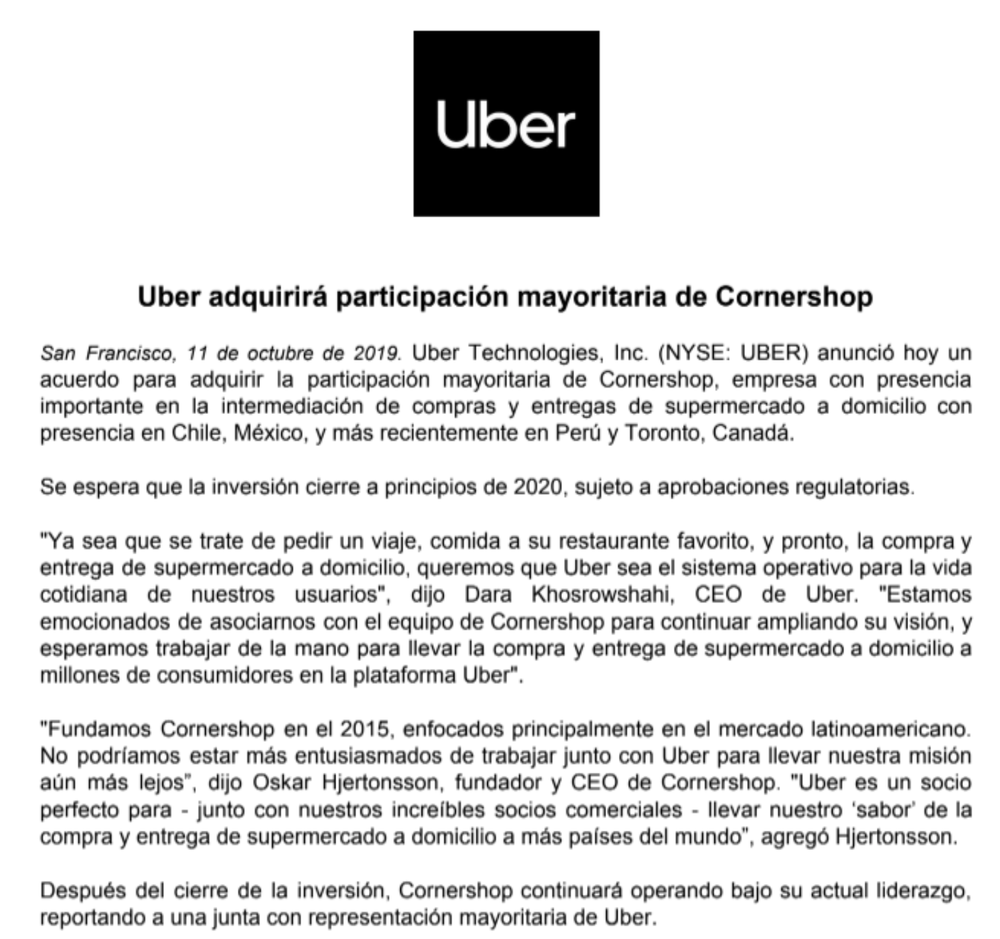 Se espera que la transacción, que mantendría a la cabeza a los fundadores de Cornershop pero formaría a una junta administrativa con representación mayoritaria de Uber, cierre en 2020 tras la aprobación de los órganos regulatorios.