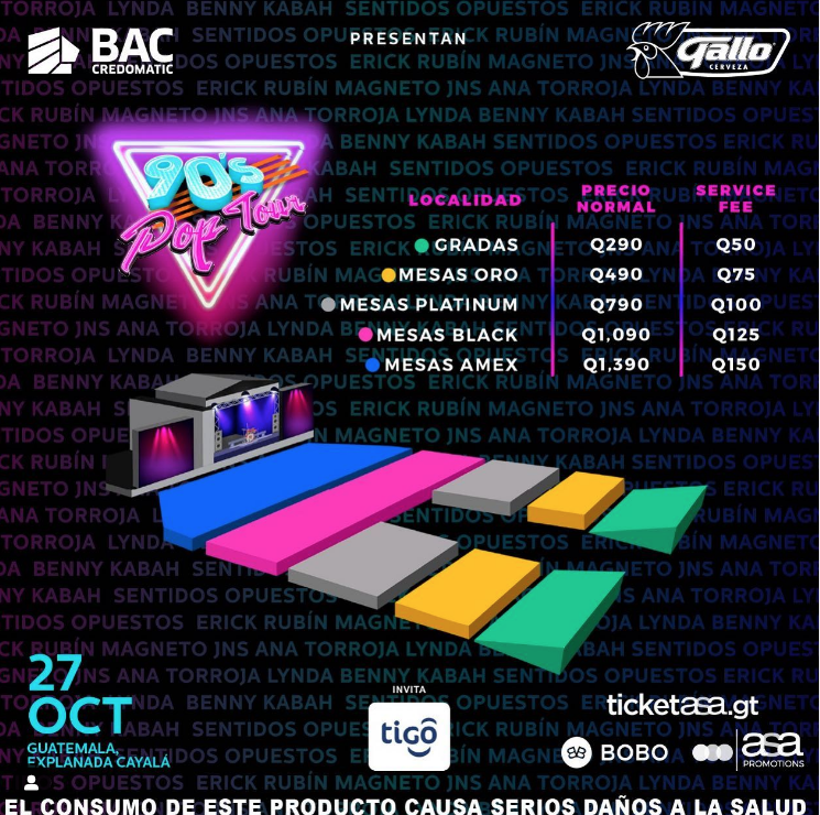 Los precios son: Gradas Q290, Mesas Oro Q490, Mesas Platinum Q790, Mesas Black Q1,090 y Mesas Amex Q1,390, más servicios free en cada localidad.