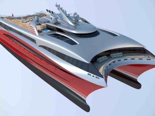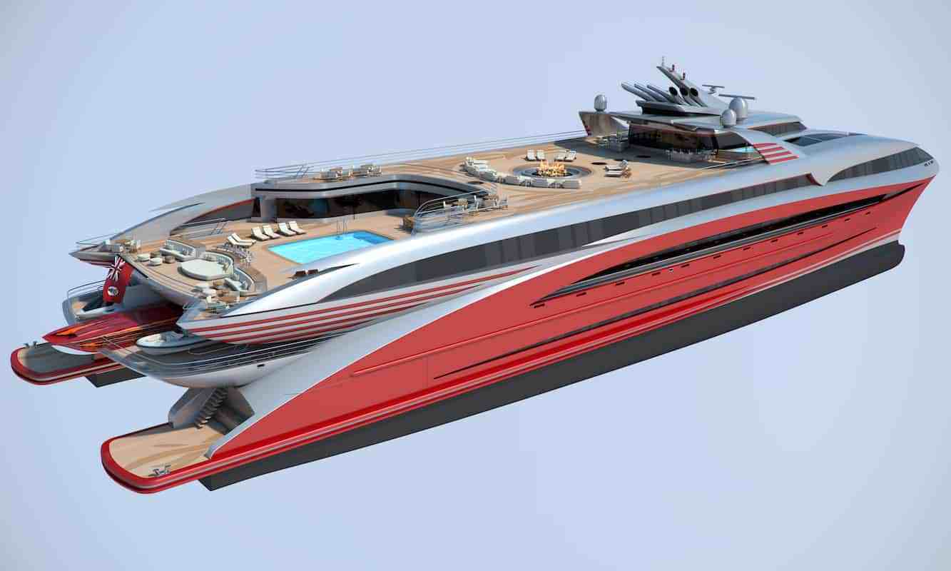Por otro lado, el diseño de este catamarán es algo fuera de este mundo. Su casco en color rojo lo convierte en una flamante máquina acuática, mide 85 metros y se desarrollará con una estructura híbrida diseñada por la Marina de los Estados Unidos.