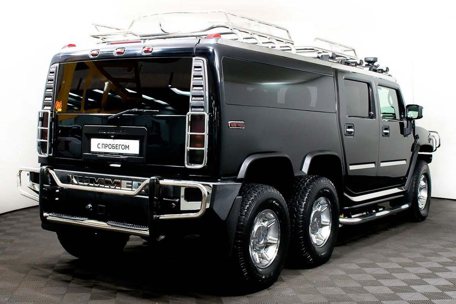 Hummer H2, es una descomunal camioneta 6×6 que salta a la vista con una carrocería extendida que da cabida a un tercer eje, incorporado dentro del sistema de tracción para entregar potencia.