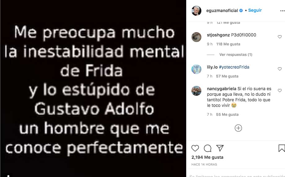 “Me preocupa mucho la inestabilidad a mental de @fridasofia y lo estúpido de @gustavoadolfo un hombre que me conoce perfectamente”.