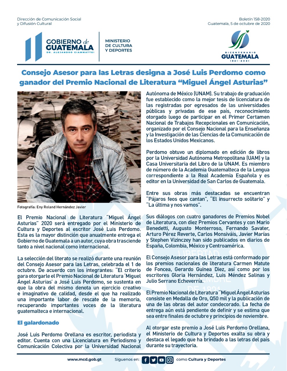 José Luis Perdomo Orellana fue seleccionado por los integrantes del Consejo Asesor para las Letras, del Ministerio de Cultura y Deportes (MCD), como el ganador del Premio Nacional de Literatura Miguel Ángel Asturias 2020.