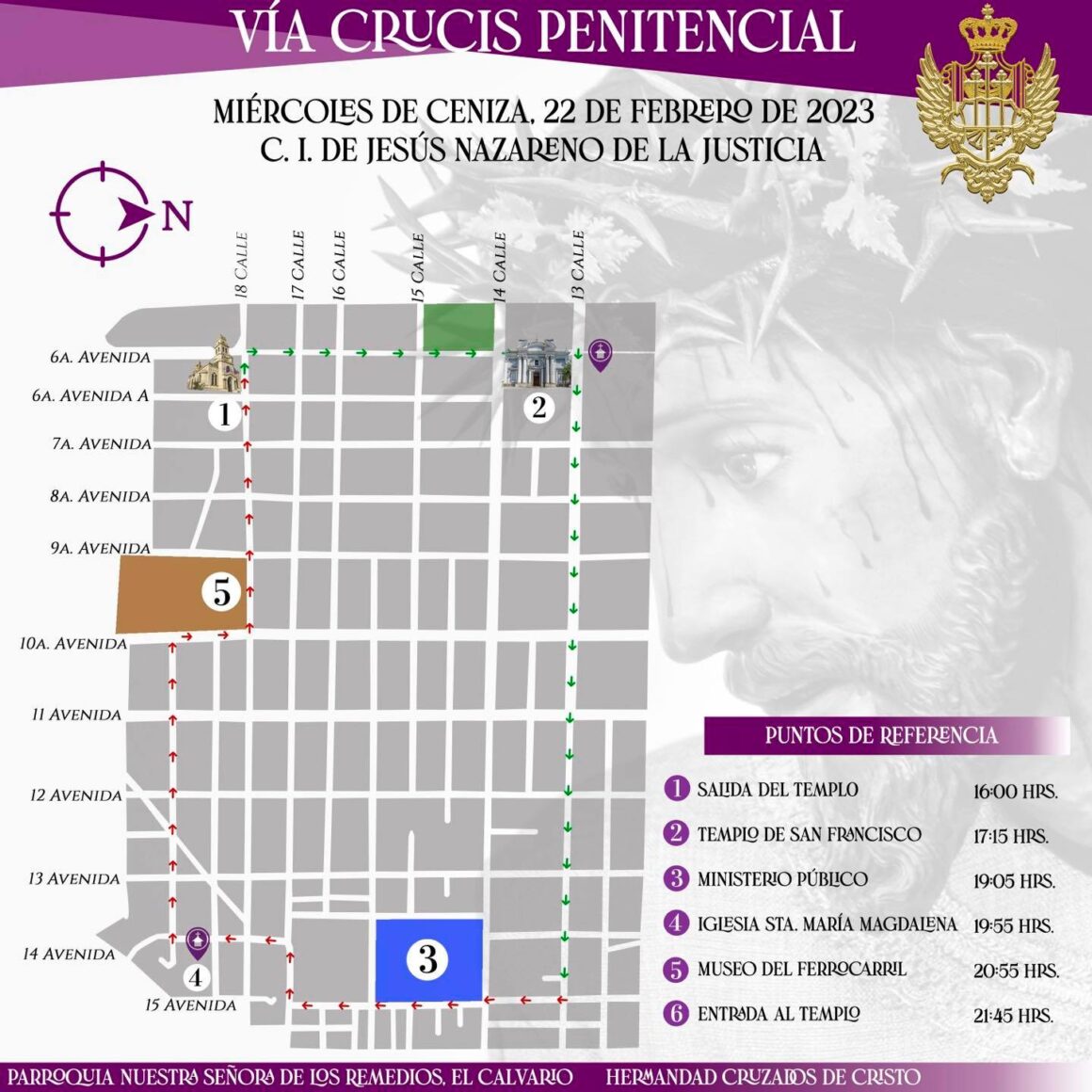 Este 22 de febrero, se conmemora el inicio de la Cuaresma que da inicio con el Miércoles de Ceniza. Como parte de las actividades que se tienen planificadas para este día, el templo de El Calvario anunció el recorrido de la procesión de la consagrada imagen de Jesús Nazareno de la Justicia.