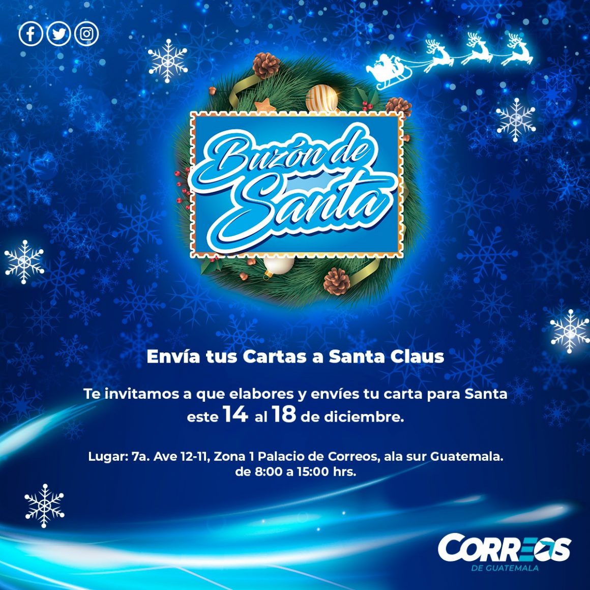 Además, la Dirección de Correos y Telégrafos de Guatemala indicó que el jueves 17 de diciembre, habrá una actividad especial, Santa Claus visitará el Palacio de Correos para ayudar a los pequeños a escribir su carta.