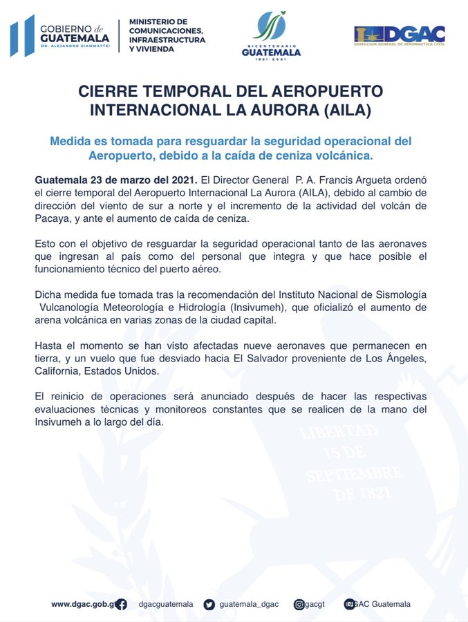 El director de Aeronáutica Civil, Francis Argueta Aguirre informó que los vuelos permanecerán suspendidos en el Aeropuerto Internacional La Aurora por recomendación del Instituto Nacional de Sismología, Vulcanología, Meteorología e Hidrología (INSIVUMEH).