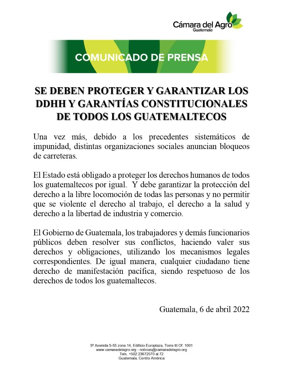 “De igual manera, cualquier ciudadano tiene derecho de manifestar pacíficamente, siendo respetuoso de los derechos de todos los guatemaltecos”, concluye Camagro.