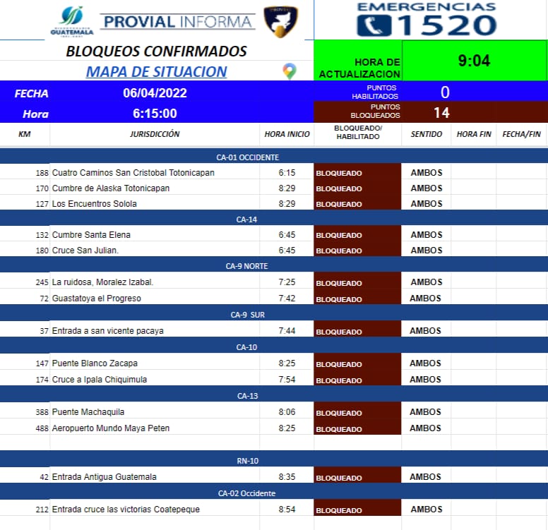 De acuerdo con la última actualización de Provial se registran bloqueos en la Ruta Interamericana, Cruce a San Julián; La Ruidosa, Morales Izabal; Puente Blanco Zacapa, entrada a Antigua Guatemala; entrada a Aeropuerto Mundo Maya, Petén; entre otros.