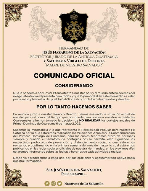 “Hemos evaluado la situación que atraviesa el país así como el tiempo que nos queda para preparar nuestras actividades cuaresmales y hemos tomado la decisión de no realizar los cortejos procesionales anuales de Primer Domingo de Cuaresma, del 6 de marzo de 2022”, se lee en el comunicado.