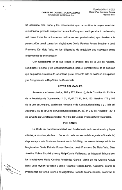 “Se suspenden también todas las actuaciones posteriores, que tiendan a la persecución penal contra los magistrados Gloria Patricia Porras Escobar y José Francisco de Mata Vela, en las diligencias de antejuicio que subyacen como antecedente de este amparo”, agrega el documento.