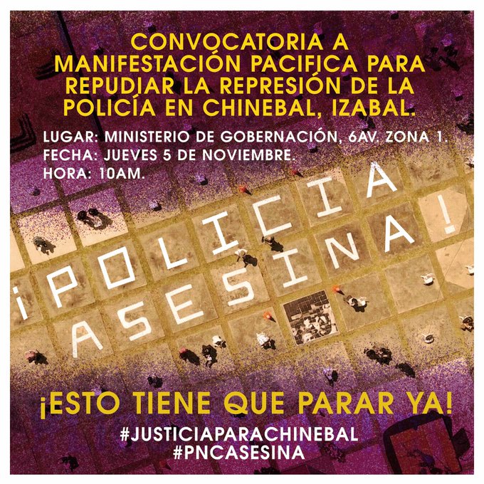 Organizaciones sociales convocan a manifestar este jueves 5 de noviembre para pronunciarse en contra del enfrentamiento entre agentes de la Policía Nacional Civil (PNC) y un grupo de personas armadas durante un desalojo en Chinebal, Izabal el pasado 31 de octubre, en el que murieron dos personas y tres policías resultaros heridos.