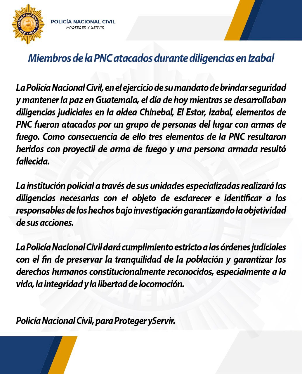 El sábado 31 de octubre, la PNC organizó el desalojo de la aldea Chinebal, en el municipio de El Estor, del departamento de Izabal. Los agentes de las fuerzas de seguridad informaron que al llegar al lugar fueron atacados por un grupo de personas armadas.
