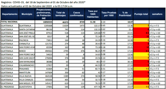 Este sábado 3 de octubre, el sistema de alertas de COVID-19 del Ministerio de Salud, indica que el municipio de Guatemala pasó de alerta roja a naranja.