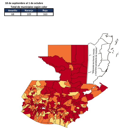Según los datos del Ministerio de Salud Pública y Asistencia Social (MSPAS), Guatemala tiene 163 municipios en alerta roja, 109 municipios en alerta naranja y 68 en alerta amarilla.