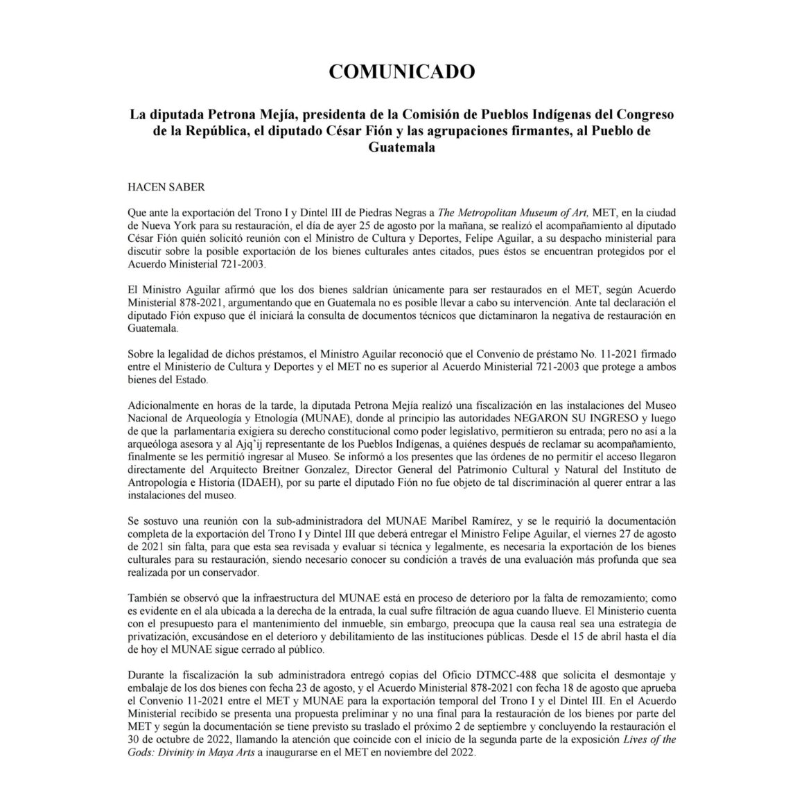 En un comunicado firmado por la diputada Petrona Mejía, presidenta de la Comisión de los Pueblos Indígenas del Congreso de la República, el diputado César Fión y organizaciones sociales, se detallan los motivos por los cuales la exportación temporal del Dintel III y el Trono I de la Ciudad Maya de Piedras Negras no cuenta con los requisitos legales para llevarse a cabo.