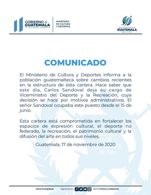 A través de un comunicado oficial del Ministerio de Cultura se confirmó la destitución de Sandoval. El documento indica que se debe a motivos administrativos.