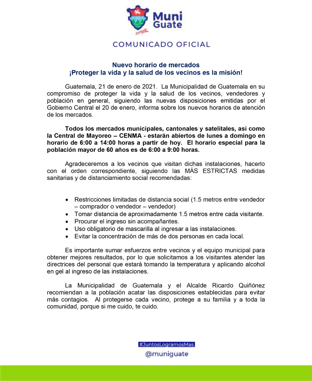 La Municipalidad de Guatemala conforme a las nuevas disposiciones, informa que todos los mercados municipales, cantonales y satelitales, así como la Central de Mayoreo (CENMA) cumplirán con el horario establecido y confirma que el horario especial para las personas mayores de 60 años es de 6 de la mañana a 9 de la mañana.