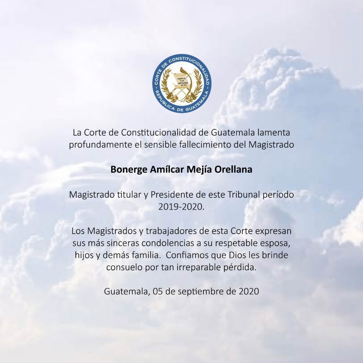 Este sábado 5 de septiembre, la Corte de Constitucionalidad (CC), confirmó la muerte del magistrado Bonerge Mejía. Diversos sectores de la sociedad expresaron sus condolencias a familiares y magistrados de la CC.
