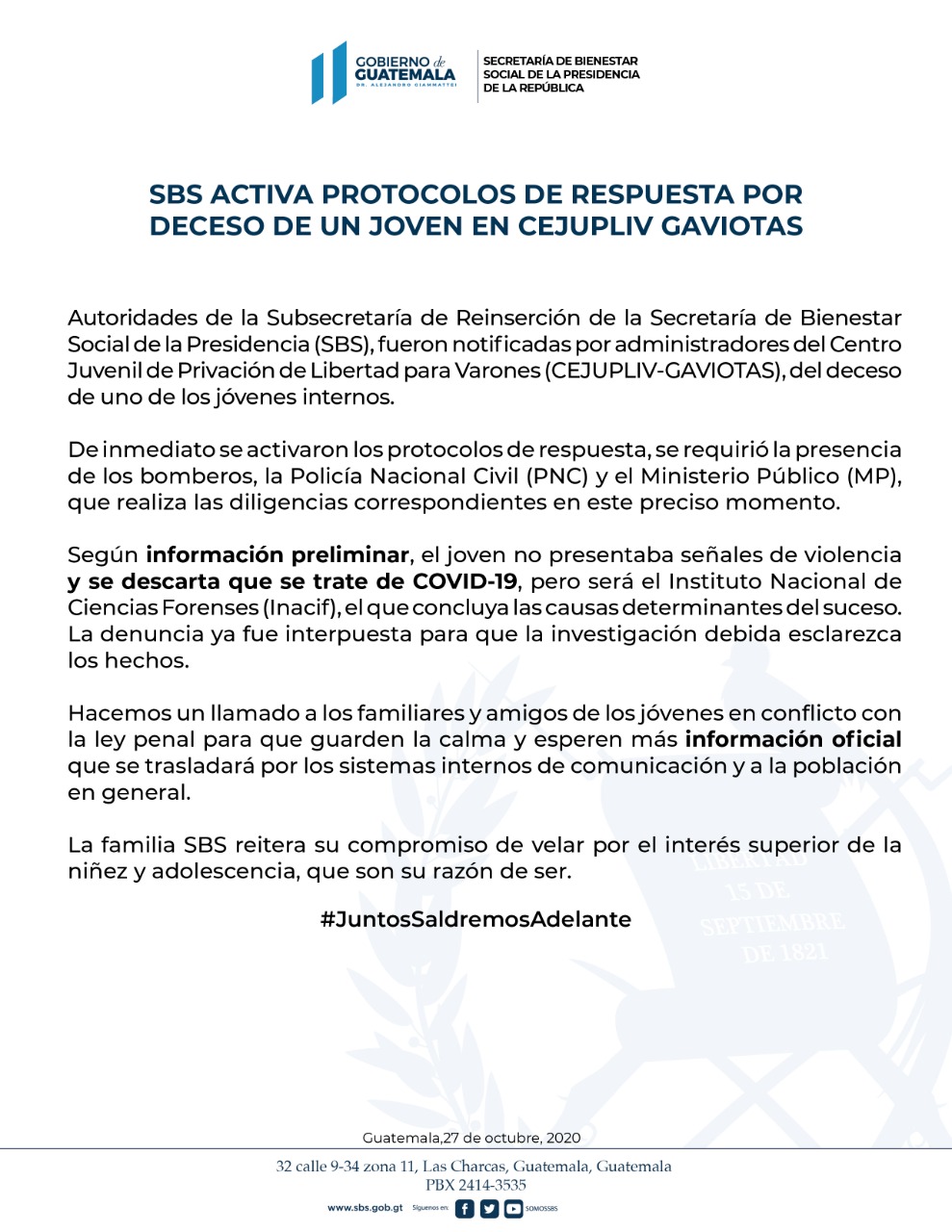 A través de un comunicado, la SBS indicó que las autoridades de la Subsecretaría de Reinserción fueron informadas por la administración del Centro Juvenil de Privación de Libertad para Varones conocido como “Las Gaviotas”.