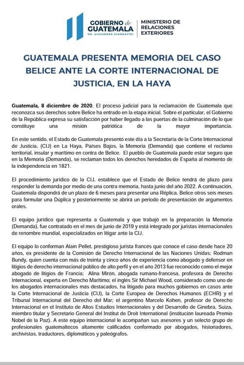 El Ministerio de Relaciones Exteriores (MINEX), publicó un comunicado en el que informó que el Estado de Guatemala presentó la memoria por el reclamo territorial, insular y marítimo con Belice ante la Corte Internacional de Justicia (CIJ, por sus siglas en inglés).