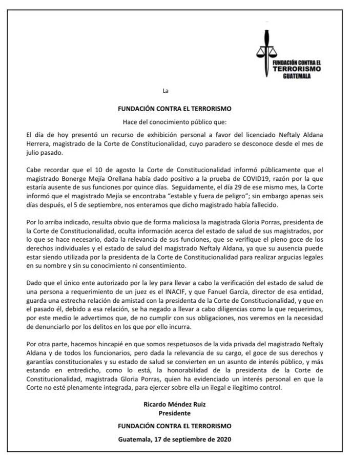 Hoy, la FTC presentó un segundo recurso de exhibición personal a favor de Neftalí Aldana. Según el comunicado de esa fundación, en la negativa a esclarecer este tema habría intencionalidad de parte de la presidenta de la CC, Gloria Porras.