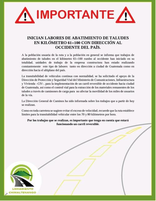 Nuevamente el Libramiento de Chimaltenango presenta un derrumbe que imposibilita el paso en el tramo carretero. De acuerdo con la Dirección General de Protección y Seguridad Vial (Provial) el derrumbe que cayó sobre tres carriles.