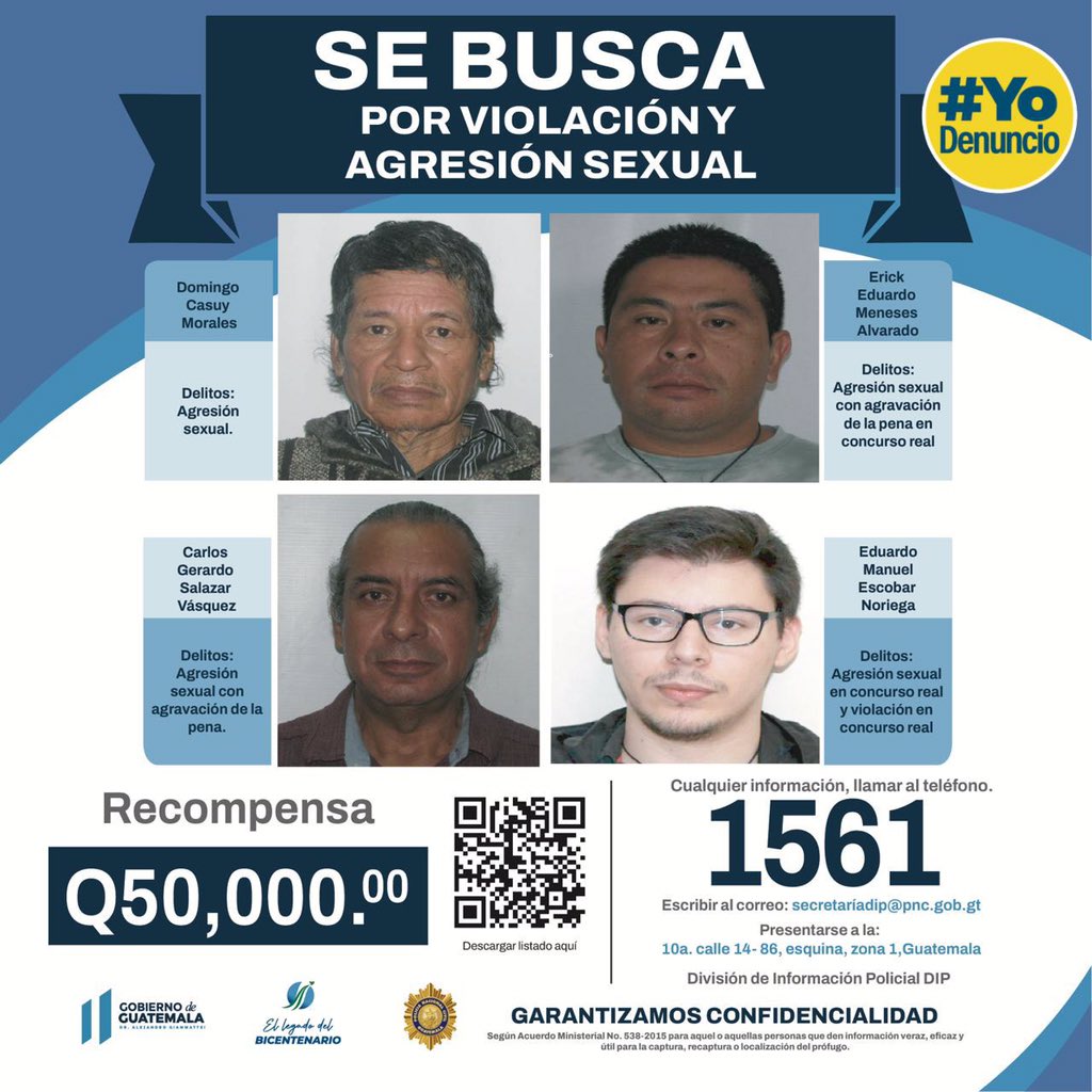 Las autoridades Ministeriales dan a conocer que la información de las personas que son buscadas estarán en la página https://losmasbuscados.mingob.gob.gt/, así como brindar información confidencial al 1561 o correo electrónico a secretariadip@pnc.gob.gt o dirigirse a la 10 a calle 14-86 zona 1