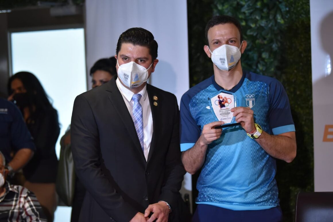El viceministro de Deporte, Mario Prado y Kevin Cordón durante la entrega del reconocimiento del Ministerio de Cultura y Deportes (Créditos: Soy502)