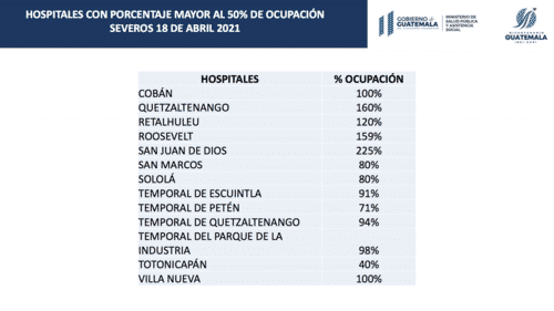 El Hospital General San Juan de Dios presenta un 225% de camas ocupadas, seguido del de Quetzaltenango, con 160% y el Roosevelt, con 159%. En total, la ministra señaló que, a nivel nacional, hay entre 100 y 120 espacios para pacientes graves.