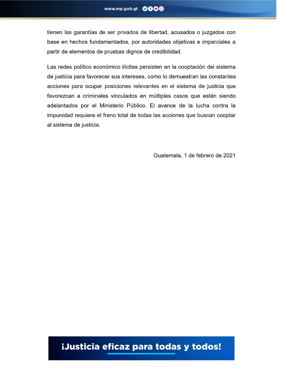“Las redes político económico-ilícitas persisten en la cooptación del sistema de justicia para favorecer sus intereses, como lo demuestran las constantes acciones para ocupar posiciones relevantes en el sistema de justicia que favorezcan a criminales en múltiples casos que están siendo adelantados por el Ministerio Público.”, detalla el MP.