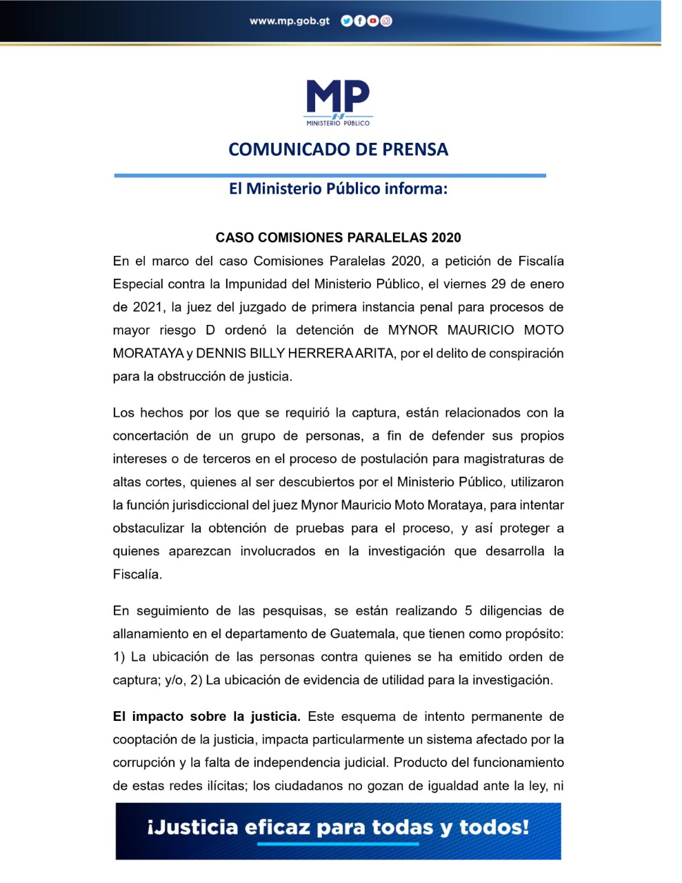 En este momento las fuerzas de seguridad llevan a cabo cinco diligencias de allanamiento en el departamento de Guatemala para efectuar la captura de Herrera Arita y Moto Morataya, así como recabar evidencia para la investigación.