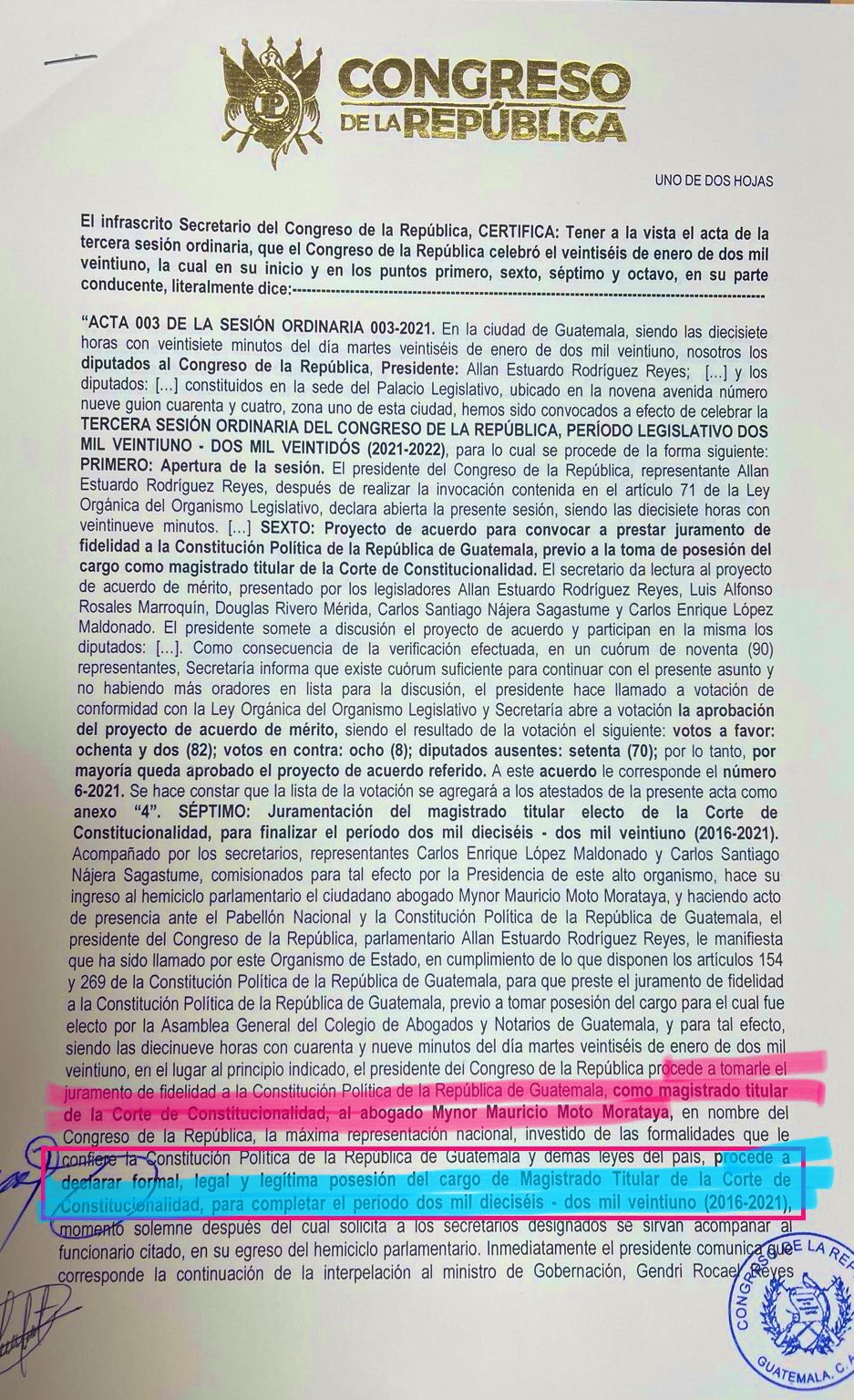 El magistrado titular de la Corte de Constitucionalidad (CC), Mynor Moto Morataya es señalado por el delito de conspiración para la obstrucción de justicia en el caso Comisiones Paralelas a cargo del Juzgado de Mayor Riesgo «D» que autorizó la detención de Moto.