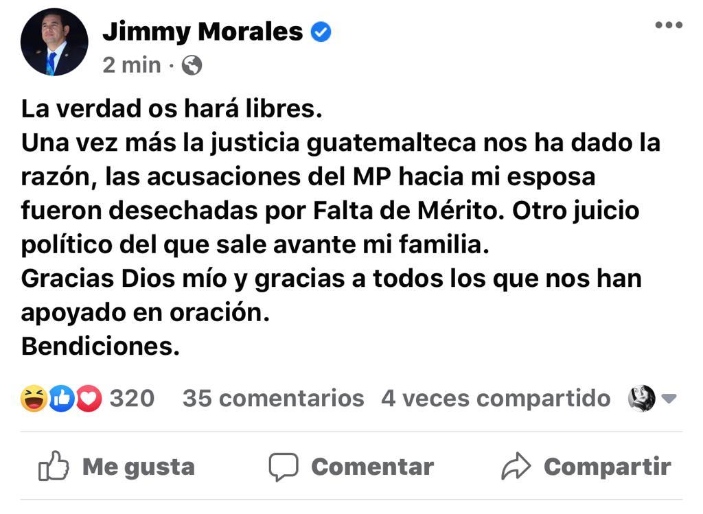 “La verdad os hará libres. Una vez más la justicia guatemalteca nos ha dado la razón, las acusaciones del MP hacia mi esposa fueron desechadas por Falta de Mérito. Otro juicio político del que sale avante mi familia. Gracias Dios mío y gracias a todos los que nos han apoyado en oración. Bendiciones”, escribió.