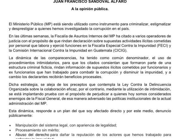 El domingo 7 de noviembre, Juan Francisco Sandoval publicó un comunicado en el que denuncia a la Fiscalía de Asuntos Internos del Ministerio Público (MP). Y asegura que es utilizado como “instrumento” para criminalizar, estigmatizar y desprestigiar a quienes han investigado la corrupción en el país.