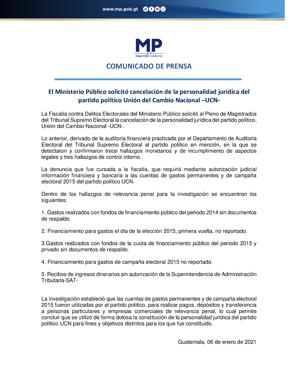 “El MP en su momento recibió la denuncia que presentó la denuncia del TSE, derivado que el departamento de auditoría electoral del TSE practicó auditoría financiera al partido político Unión del Cambio Nacional (UCN) en el periodo comprendido del primero de enero del año 2014 al 31 de diciembre del año 2015”, señaló el jefe de información y prensa del MP, Juan Luis Pantaleón.