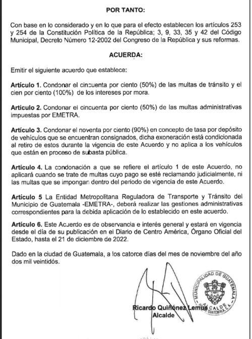La Municipalidad de Guatemala anunció un descuento de hasta el 50 % en el pago de las multas de tránsito y la exoneración de moras e intereses. La medida permanecerá vigente hasta el 21 de diciembre de este año.