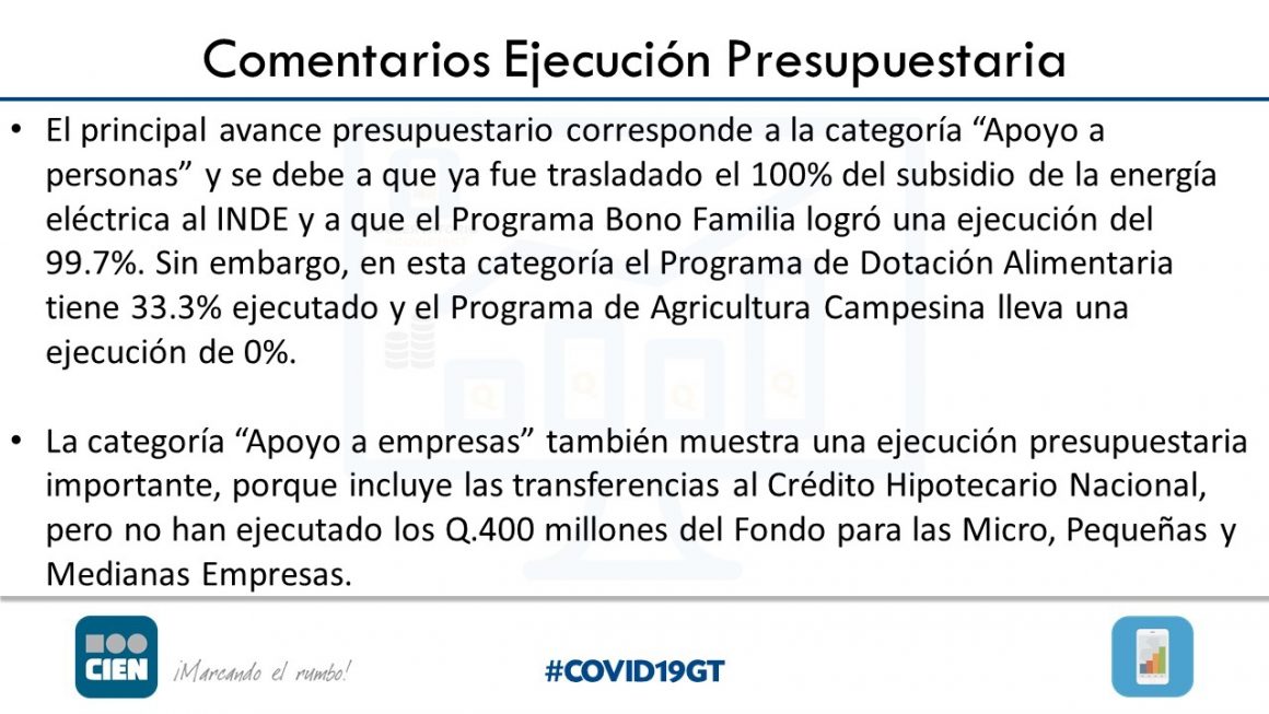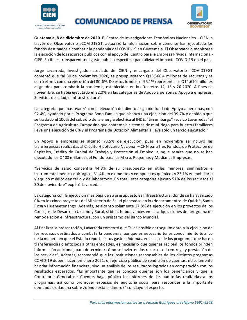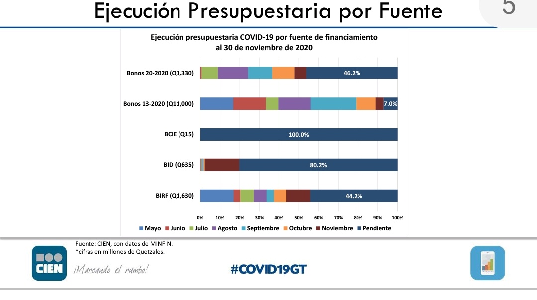 “De estos fondos, el 95.1% representan los Q14.610 millones asignados para combatir la pandemia…A finales de noviembre, se había ejecutado el 82% en las categorías de Apoyo a personas, Apoyo a empresas, Servicios de salud, e infraestructura” indica el comunicado del CIEN.