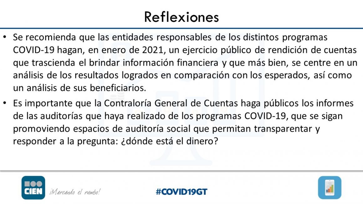 “Es importante que se conozca quiénes son los beneficiarios y que la Contraloría General de Cuentas haga público los informes de las auditorías realizadas a los programas, así como promover espacios de auditoría social para responder a la importante demanda ciudadana sobre ¿dónde está el dinero?”, concluyó Lavarreda.