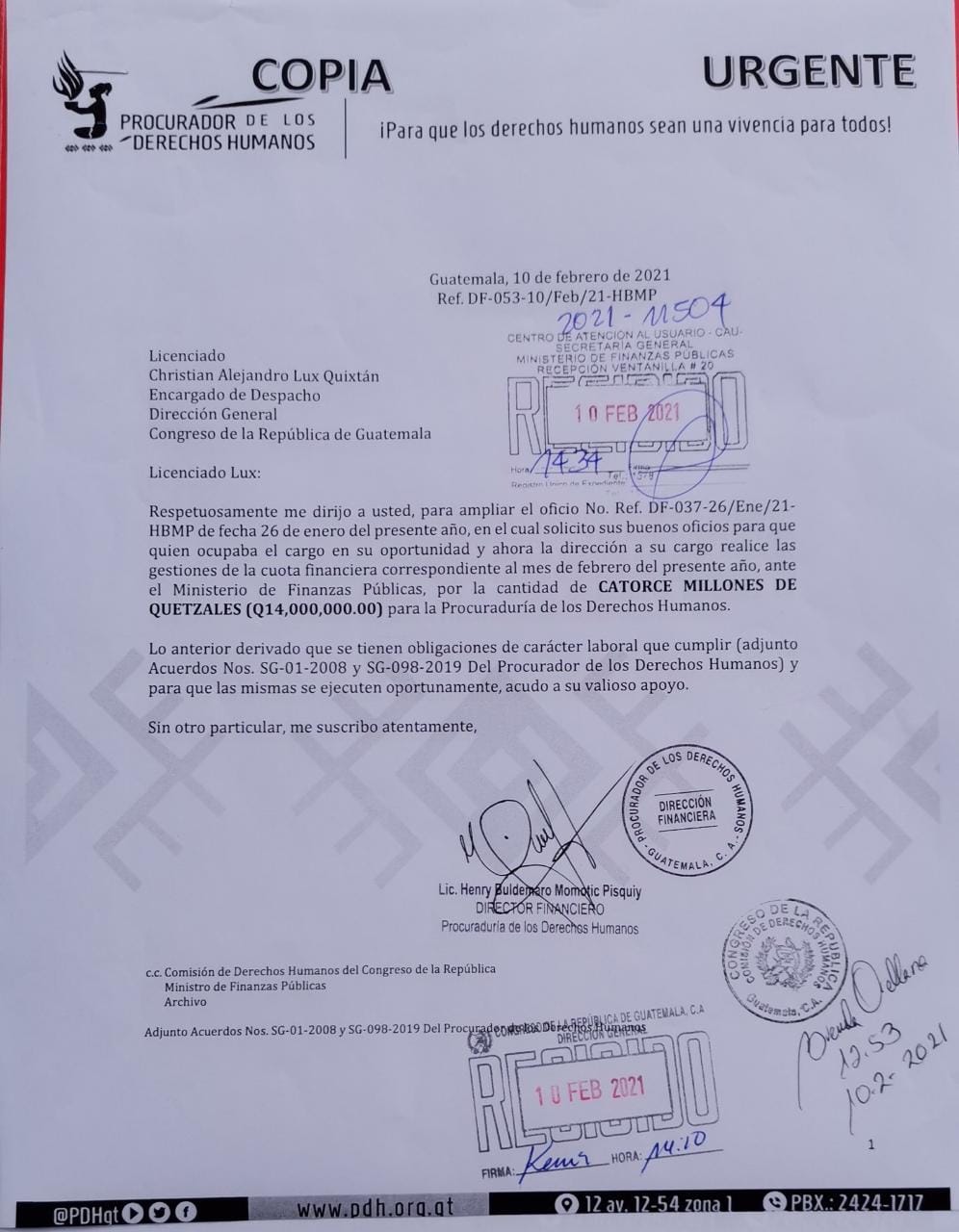 La publicación de la PDH fue acompañada de una carta enviada a Christian Alejandro Lux, encargado de despacho de la Dirección General del Congreso, en la cual se solicita que se realicen las gestiones de la cuota financiera correspondiente al mes de febrero del presente año, ante el Ministerio de Finanzas Públicas, por la cantidad de Q14 millones.