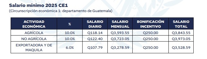 En este sentido, a partir del 1 de enero de 2025, el salario mínimo para la circunscripción económica 1, que incluye el departamento de Guatemala, será de Q 3,973.05 para el sector no agrícola, Q 3,843.55 para el sector agrícola y Q 3,528.59 para el sector maquila.