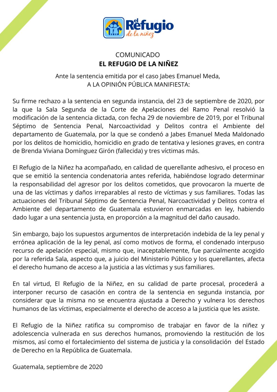El Refugio de la Niñez expresó su rechazó a “la sentencia en segunda instancia del 23 de septiembre que modifica la sentencia dictada el 29 de noviembre del 2019, por el Tribunal Séptimo de Sentencia Penal, Narcoactividad y Delitos contra el Ambiente del departamento de Guatemala, por la que se condenó a Jabes Emanuel Meda Maodonado por los delitos de homicidio en grado de tentativa y lesiones graves, en contra de Brenda Viviana Domínguez Girón (fallecida) y tres víctimas más” dice el comunicado.